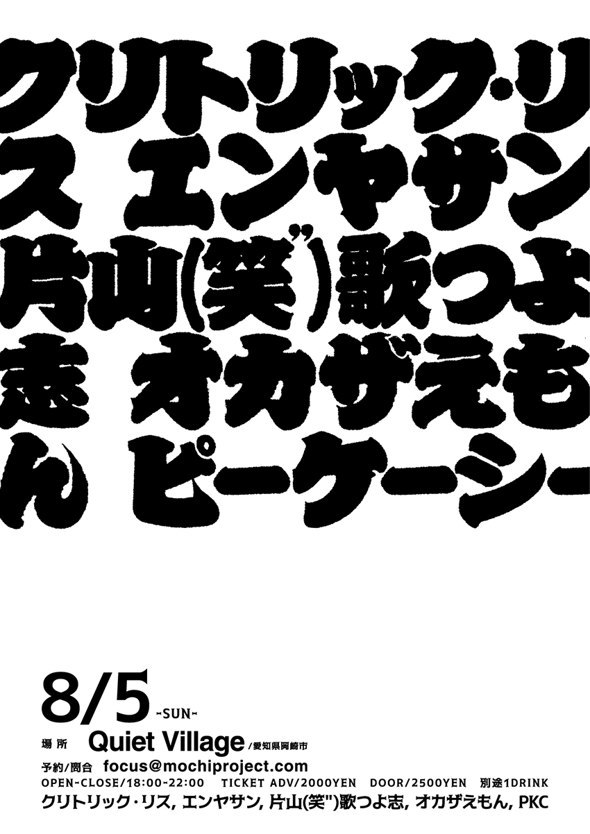 2018年8月5日日曜日 @Quiet Village 愛知県岡崎市康生通西1-10 2F 名鉄「東岡崎駅」北口より徒歩10分 OPEN-CLOSE/18:00-22:00 TICKET ADV/2000YEN DOOR/2500YEN 別途1drink 問合/ focus@mochiproject.com